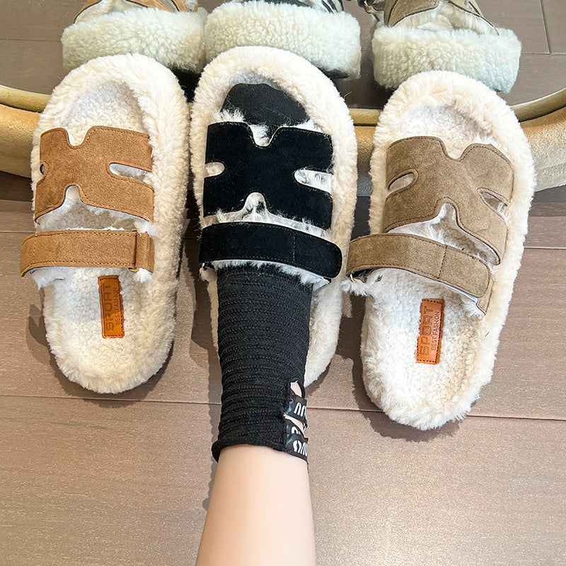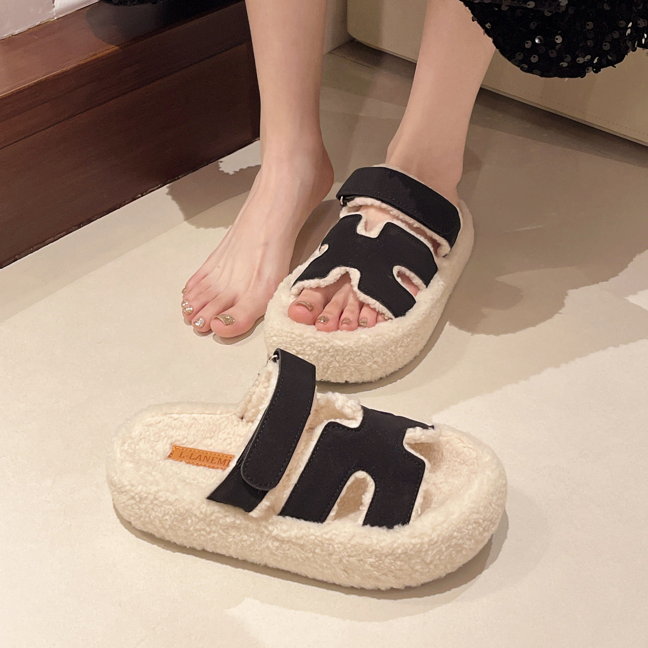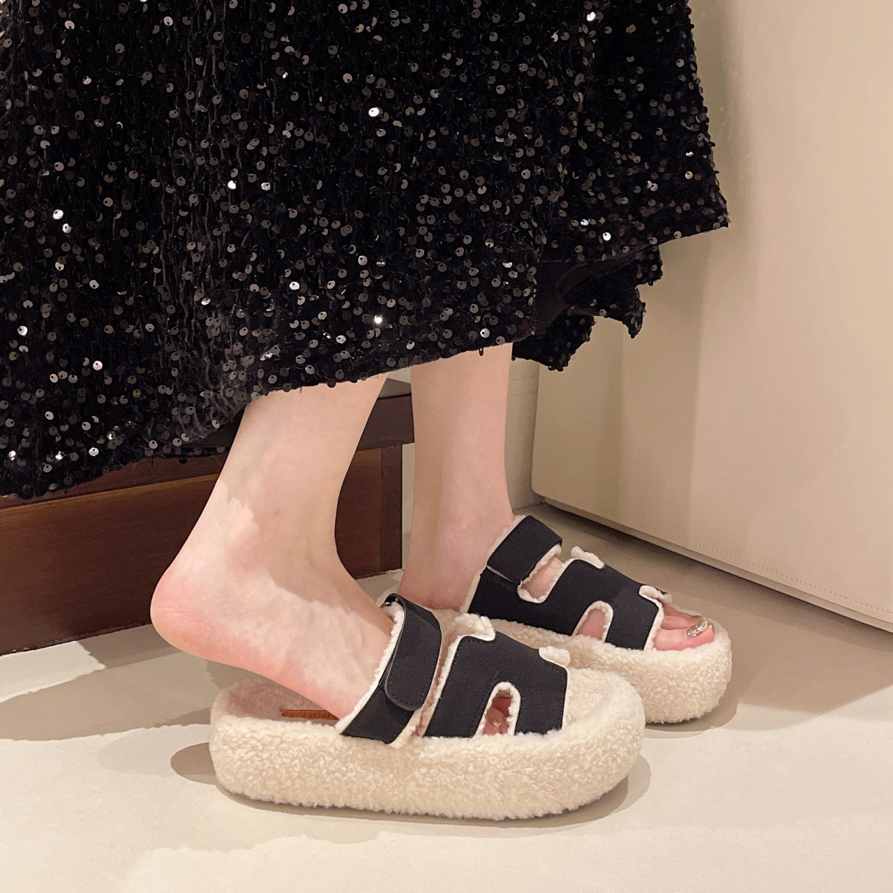 نعال نسائية من الفرو بنعل سميك - مخمل إضافي، غير قابل للانزلاق، ودافئ لفصل الخريف والشتاء، نعال قطنية جديدة