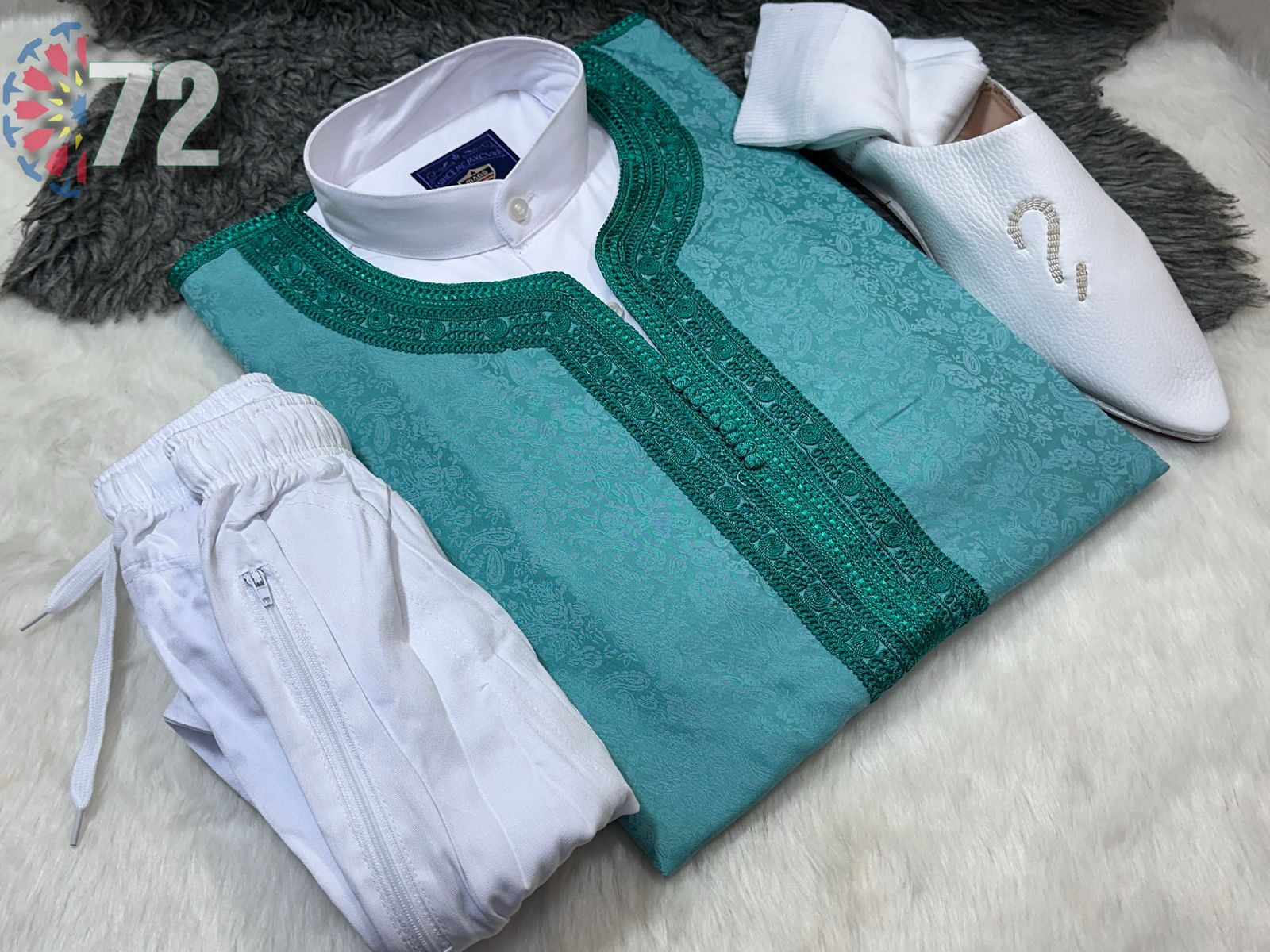 طقم مكون من 5 قطع: كندورة، قميص، بنطلون، نعال مميزة وجوارب – إطلالة متكاملة من الأناقة والفخامة