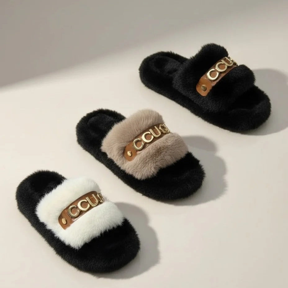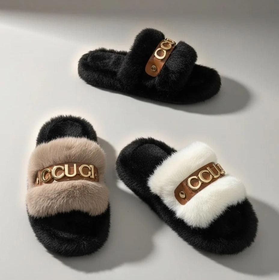 أحذية منزلية نسائية من الفرو الناعم - تدفق هواء دافئ، حزام مبطن