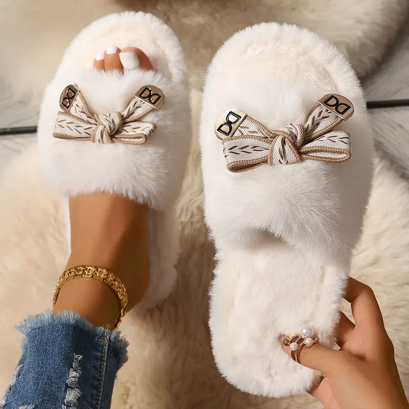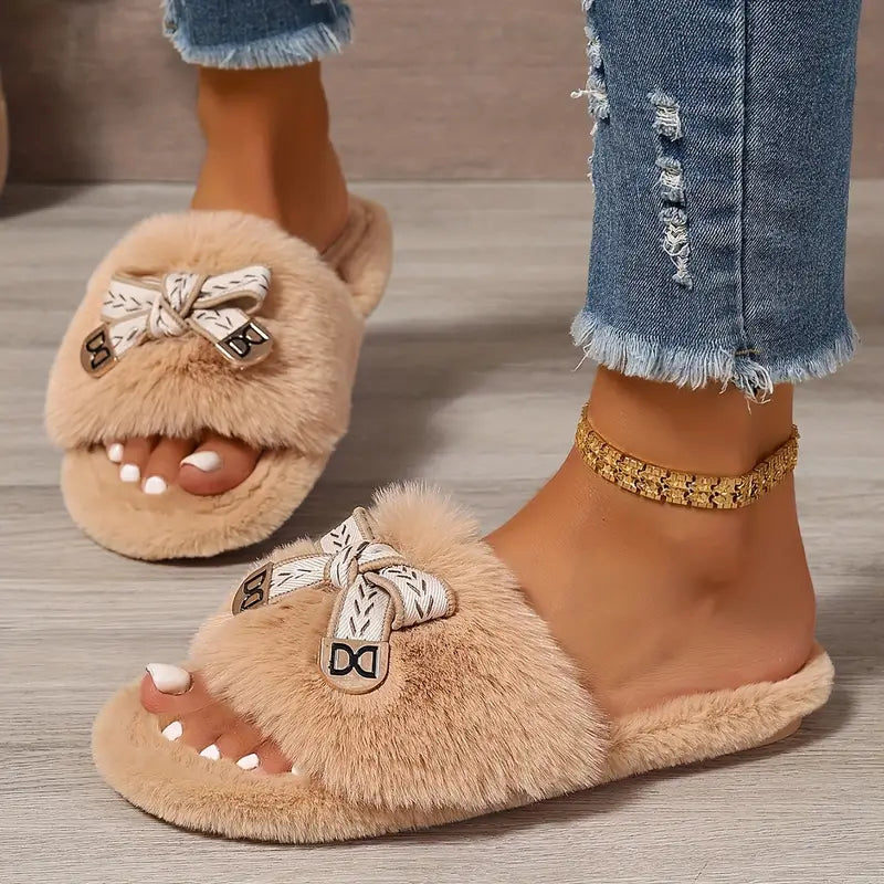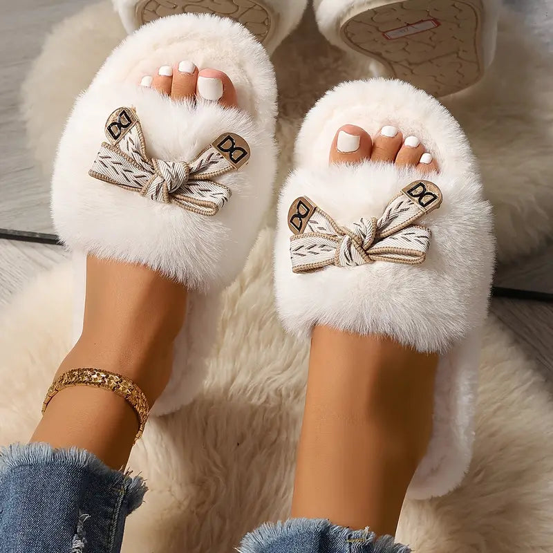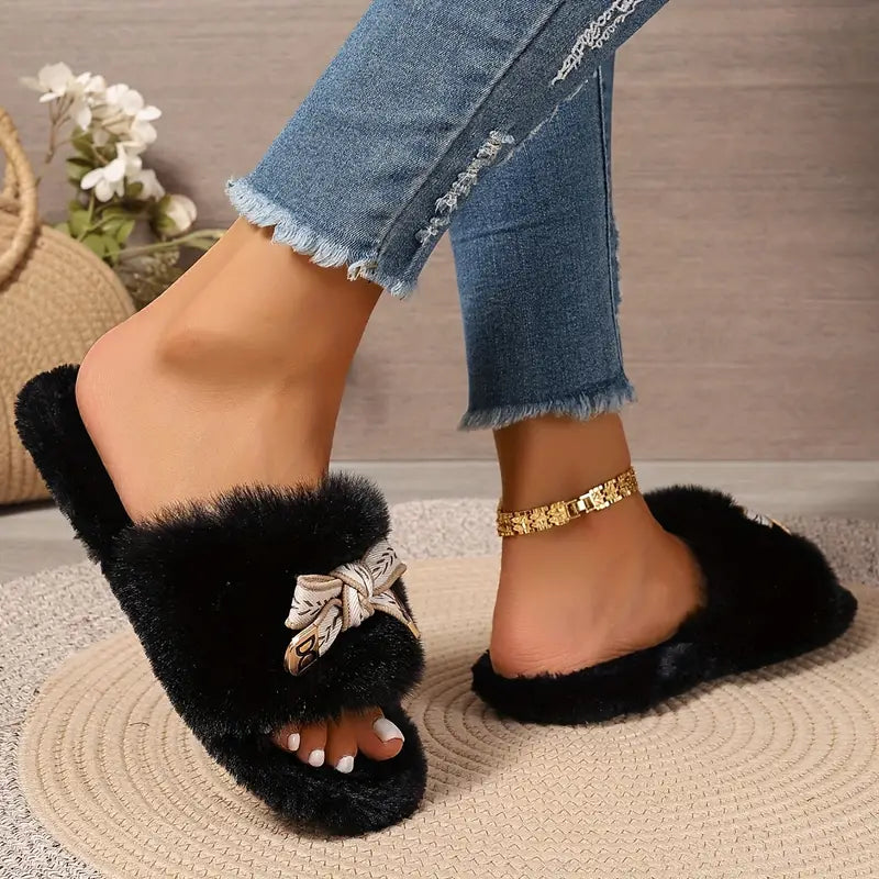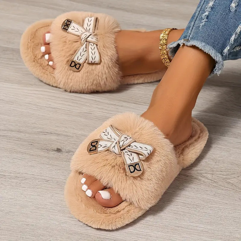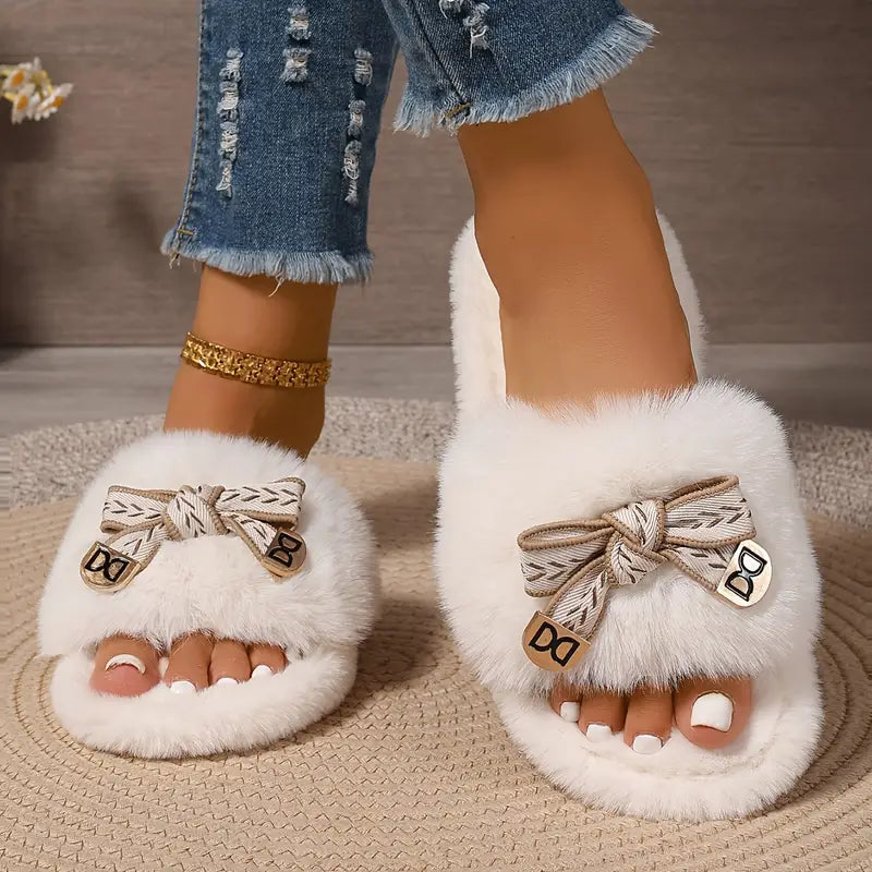 EVA نعال نسائية من الفرو الصناعي الناعم مع عقدة فيونكة لطيفة، مبطنة بقماش مريح غير قابل للانزلاق من مادة