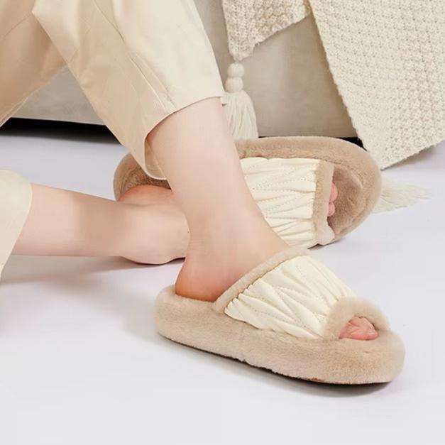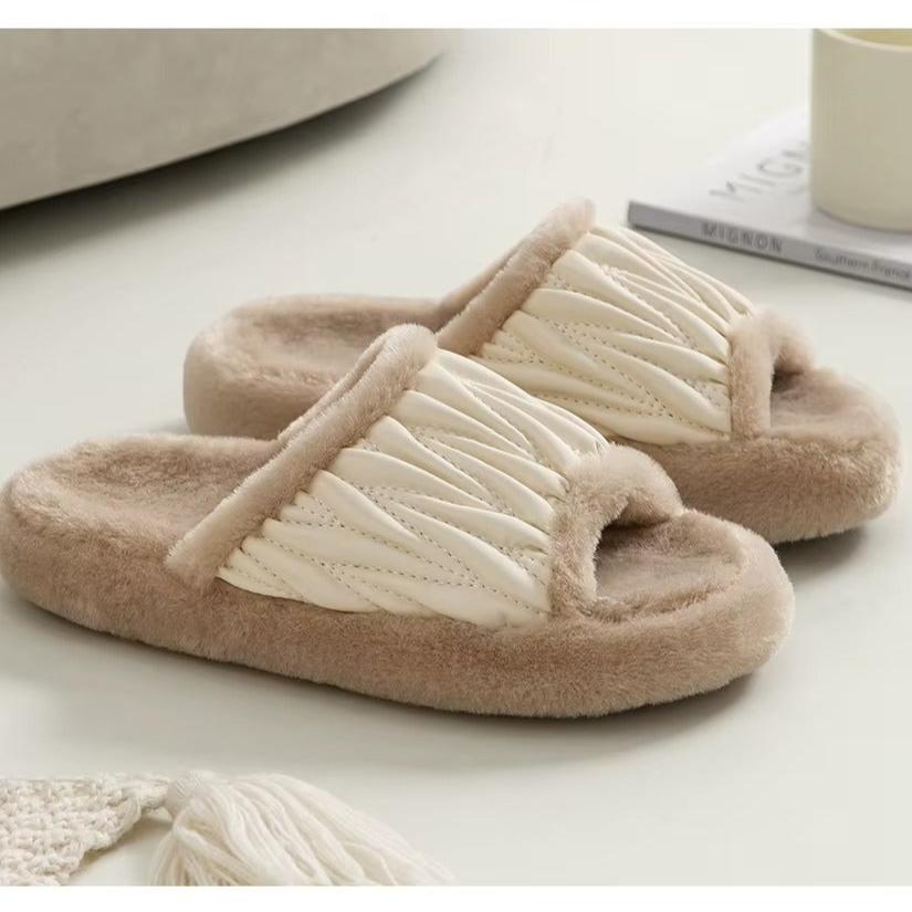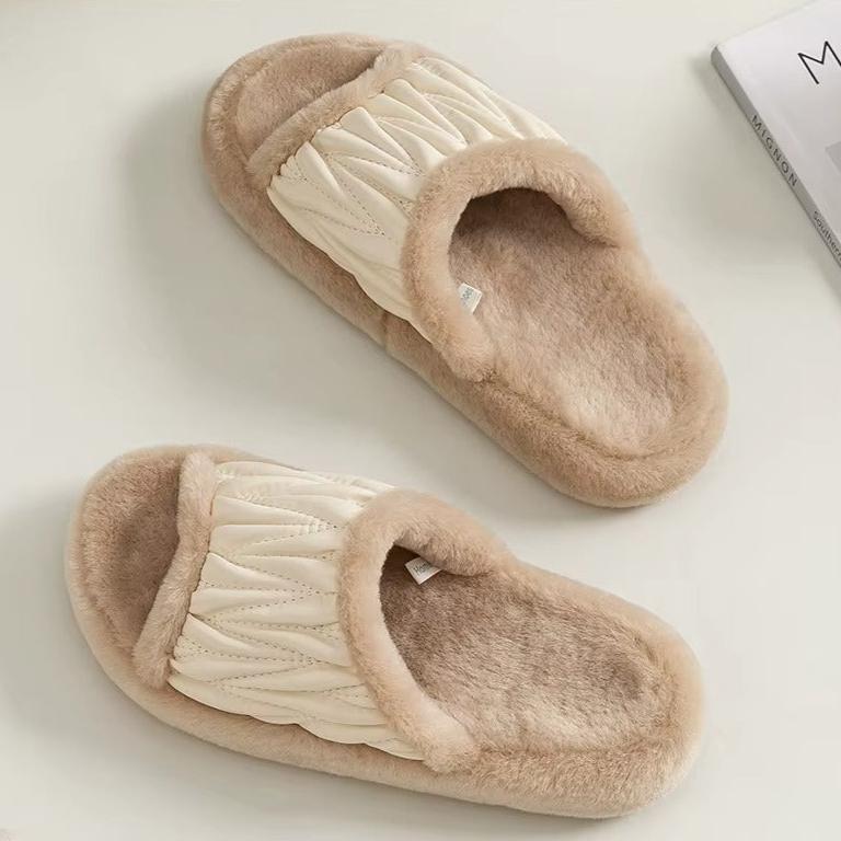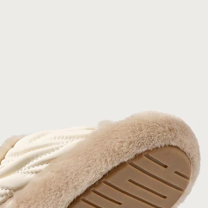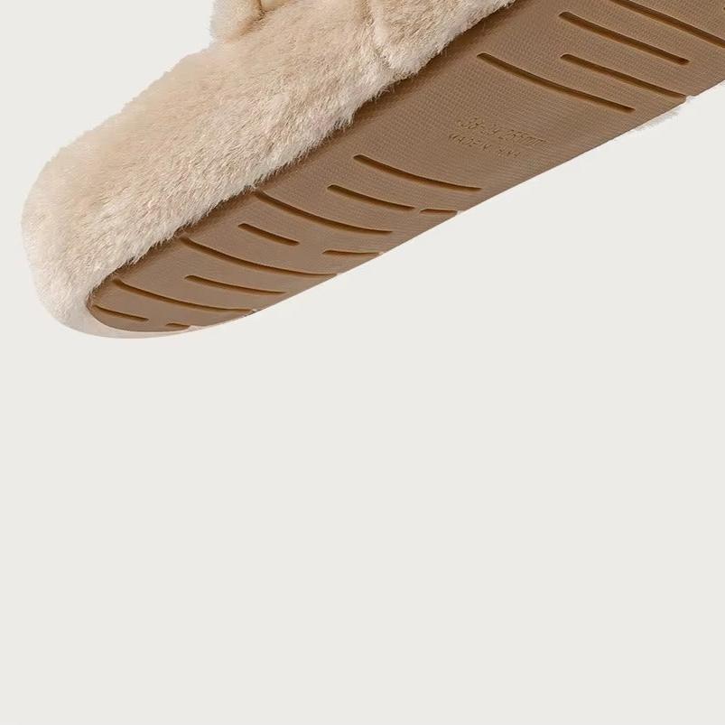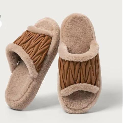 "شبشب نسائي دافئ في الشتاء من قماش جلدي وتصميم مبطن ونعل خارجي مضاد للانزلاق ومريح للمنزل والمكتب."