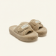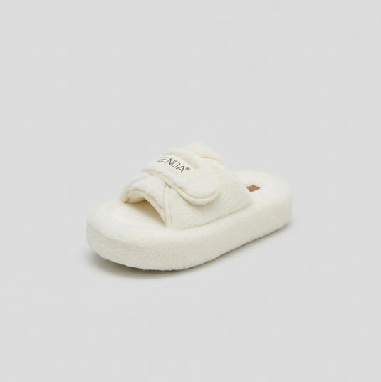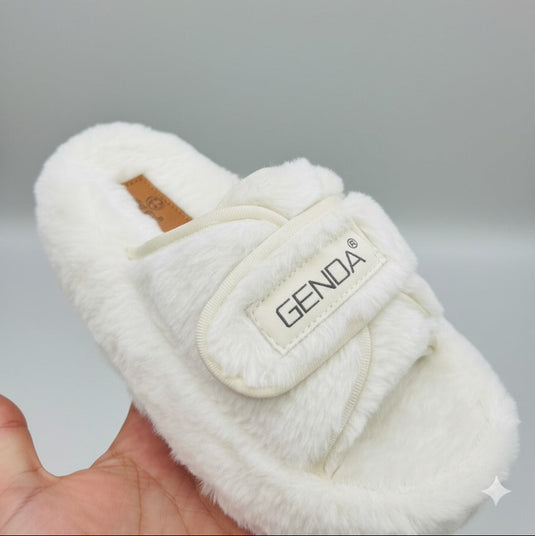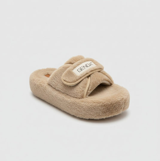 - Materials: Soft plush synthetic upper and lining; adjustable hook‑and‑loop strap; cushioned lightweight footbed.