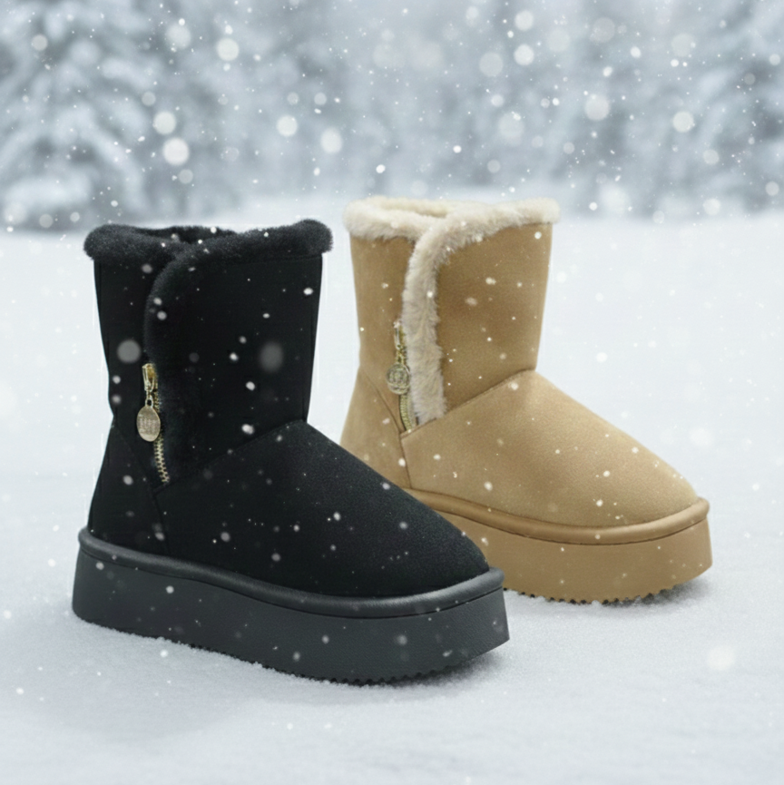 Adoptez un style moderne et chaleureux avec ces bottines d'hiver pour femme en suédine . Conçues pour un usage quotidien en hiver, elles présentent un extérieur doux effet daim associé à une doublure moelleuse en fausse fourrure pour une isolation et un confort optimaux. Leur silhouette minimaliste est rehaussée d'une élégante fermeture éclair latérale et d'un charm décoratif, ajoutant une touche de raffinement. Une semelle plateforme épaisse et légère assure une excellente stabilité et un amorti optimal, rendant ces bottines idéales pour les longues journées d'hiver. Parfaites pour une tenue décontractée, vos courses hivernales ou vos activités de plein air en toute tranquillité.