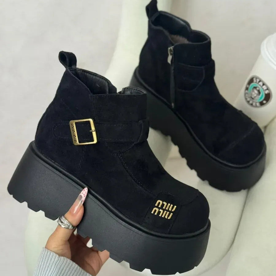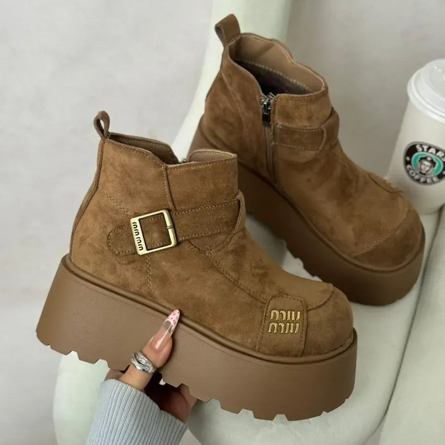 Chaussures élégantes et décontractées en daim pour femmes, à semelle compensée et bride à boucle.