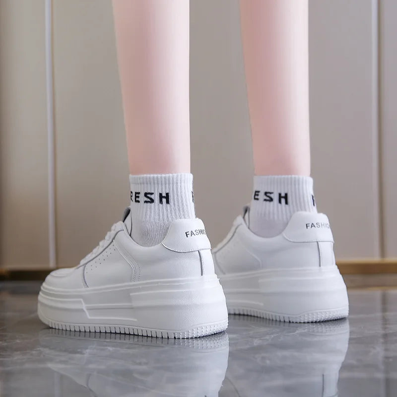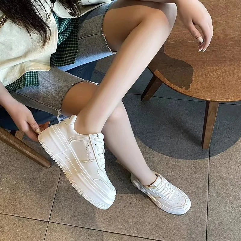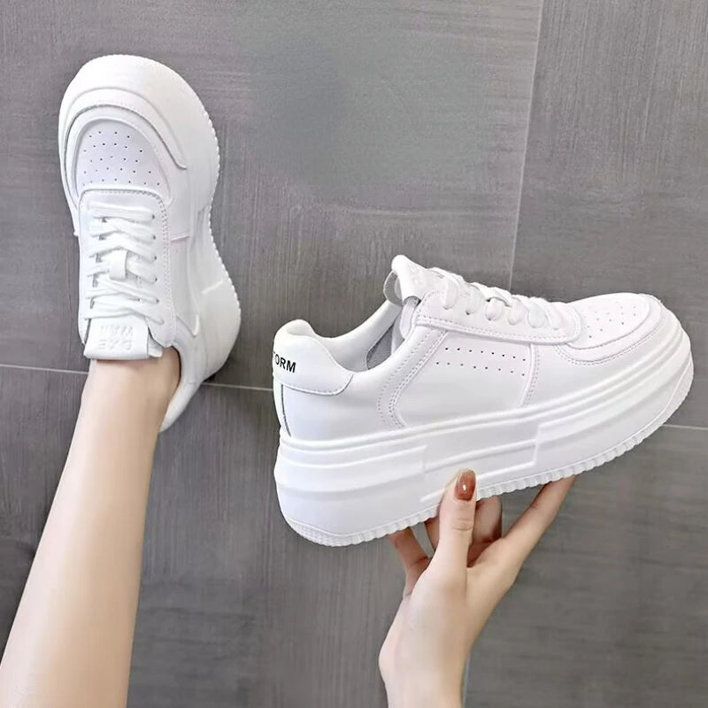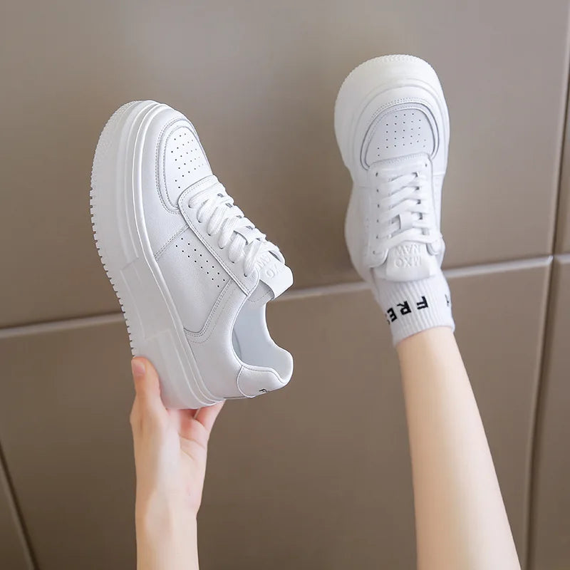حذاء رياضي نسائي من الجلد باللون الأبيض ونعل سميك ورباط
